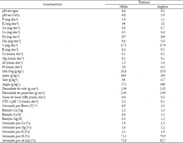 Tabela 1. Características químicas e físicas dos solos utilizados no experimento. Table 1. Chemical and physical characteristics of the soils used in the experiment.