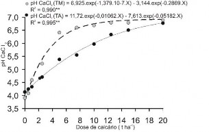 No presente trabalho, o pH em CaCl2, nos dois solos, apresentaram ajuste exponencial com as doses de calcário, devido ao aumento do pH em função da dose de calcário aplicada.