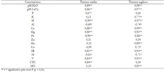 Tabela 2. Correlação entre as características químicas, em solo com textura média e com textura argilosa em função das doses de calcário.