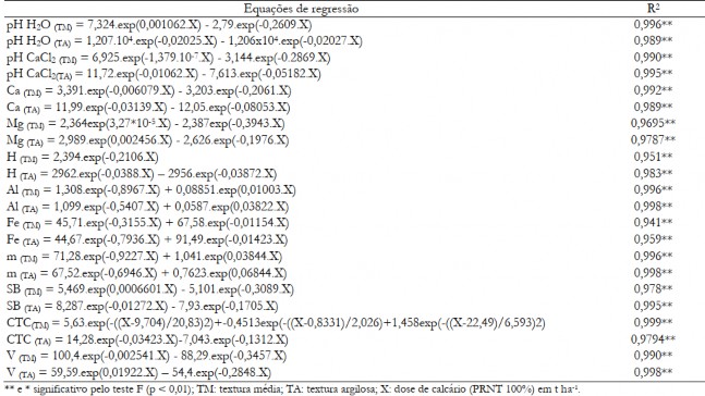 Table 3. Regression equations for the chemical attributes studied in soils with different textures, as a function of limestone rates.