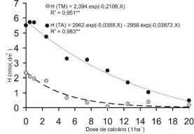 O teor de H+ diminuiu com o aumento das doses de calcário (Figura 2). No solo TM, os teores de H+ variaram de 2,41 a 0,00 cmolc dm-3 e no solo TA variaram entre 5,83 e 0,38 cmolc dm-3, para as doses de 0 e de 20,0 t ha-1, respectivamente. Nesse caso, os valores médios totais observados para H+ foram de 0,98 cmolc dm-3 no TM e de 3,38 cmolc dm-3 no TA.