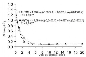 Os teores de Al (Figura 3) no solo TM e solo TA diminuíram com as doses de calcário. Esses resultados são semelhantes aos que foram observados para os teores de H+. E, no caso do Al, ocorre porque esse elemento também tem seu teor reduzido com a calagem já que, tanto Al quando H proporcionam caráter ácido ao solo.