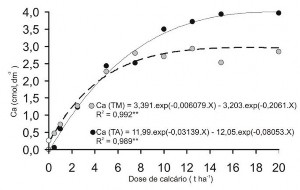 Os teores de Ca (Figura 4) aumentaram com as doses de calcário, variando de 0,18 a 3,05 cmolc dm-3, no solo TM, e de 0,00 a 4,15 cmolc dm-3, no solo TA (entre as doses de 0,0 e de 20,0 t ha-1). Os teores médios de Ca na testemunha foram, respectivamente, 0,19 cmolc dm-3 e 0,06 cmolc dm-3 para os solos TM e TA.