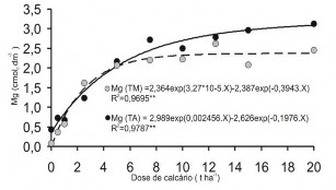 Os teores de Mg (Figura 5) aumentaram com as doses de calcário, observando-se variação entre 0,00 e 2,25 cmolc dm-3, para as dose de 0,0 t ha-1 e de 20,0 t ha-1, respectivamente, no solo TM; e entre 0,00 e 3,10 cmolc dm-3, no solo TA, nas mesmas doses.