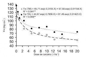 Os teores de Fe (Figura 6) diminuíram com o aumento da dose de CaCO3, independentemente da textura do solo. Com teores que variaram de 122,8 a 47,6 mg dm-3 no TM; e de 145,4 a 63,9 mg dm-3 no TA; entre as doses de 0,0 e de 20,0 t ha-1.