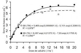 Considerando as diferentes texturas, a SB apresentou tendência linear até 6 t ha-1 de CaCO3. Em doses superiores, o aumento na SB não foi proporcional à dose de calcário. Nas doses acima de 10 t ha-1 de CaCO3 observou-se tendência de estabilização da curva de SB, em solos TA.