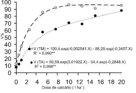 Figure 9. V% in soils with medium texture (TM) and clayey texture (TA) as a function of limestone doses obtained by the CaCO3 incubation method.