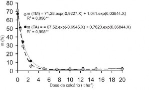 Figure 10. m% in soils with medium texture (TM) and clayey texture (TA) as a function of limestone doses obtained by the CaCO3 incubation method.